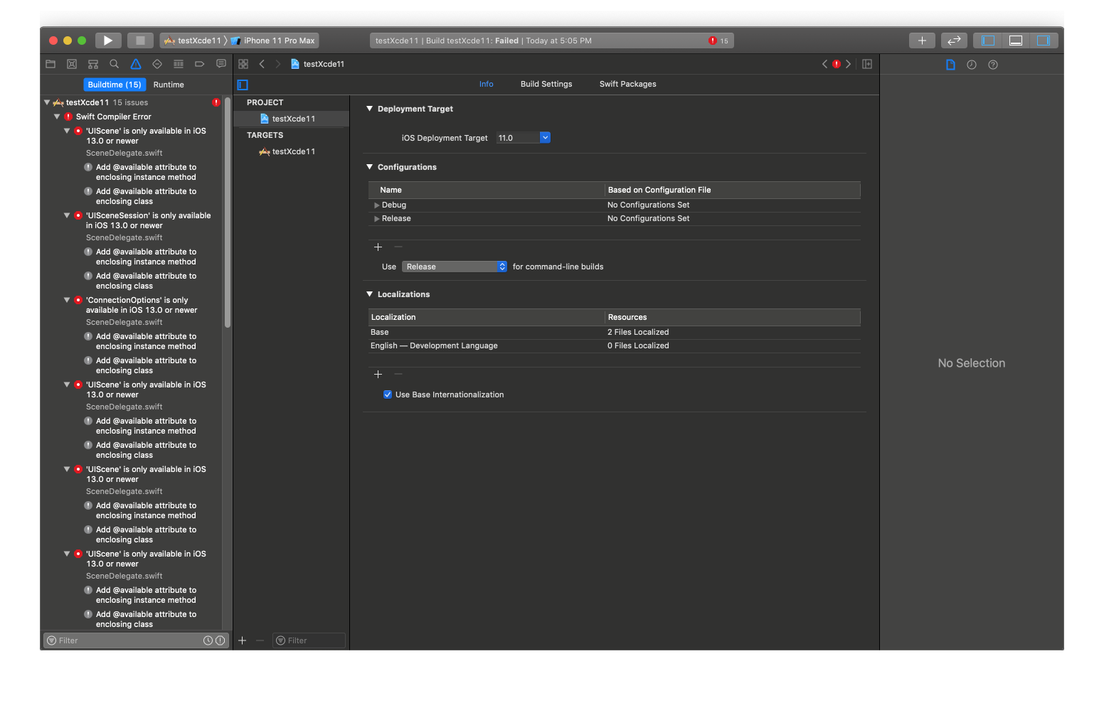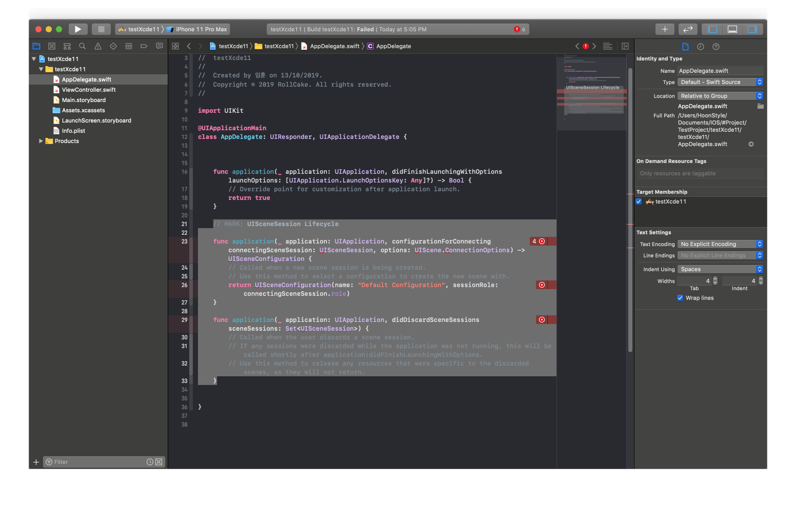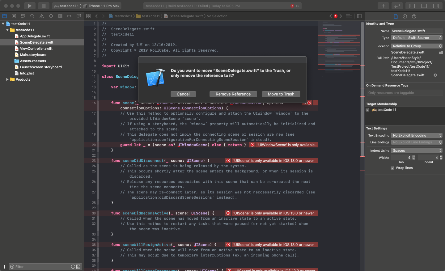 타겟을 내리고 빌드를 한다면 가차 없이 AppDelegate와 SceneDelegate에서 에러를 냅니다.