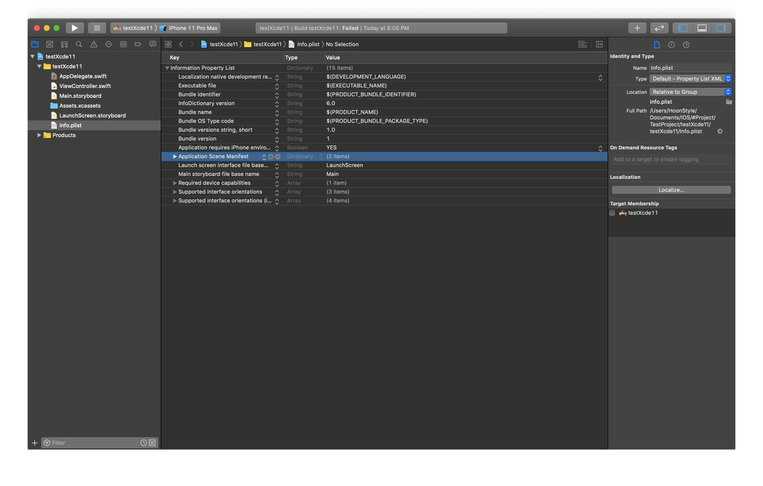 5. info.plist의 Application Scene Manifest를 삭제한다.